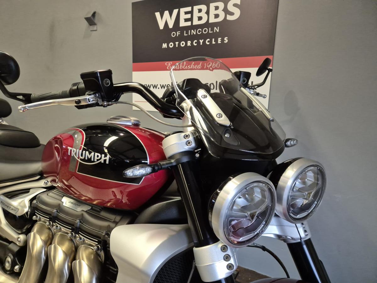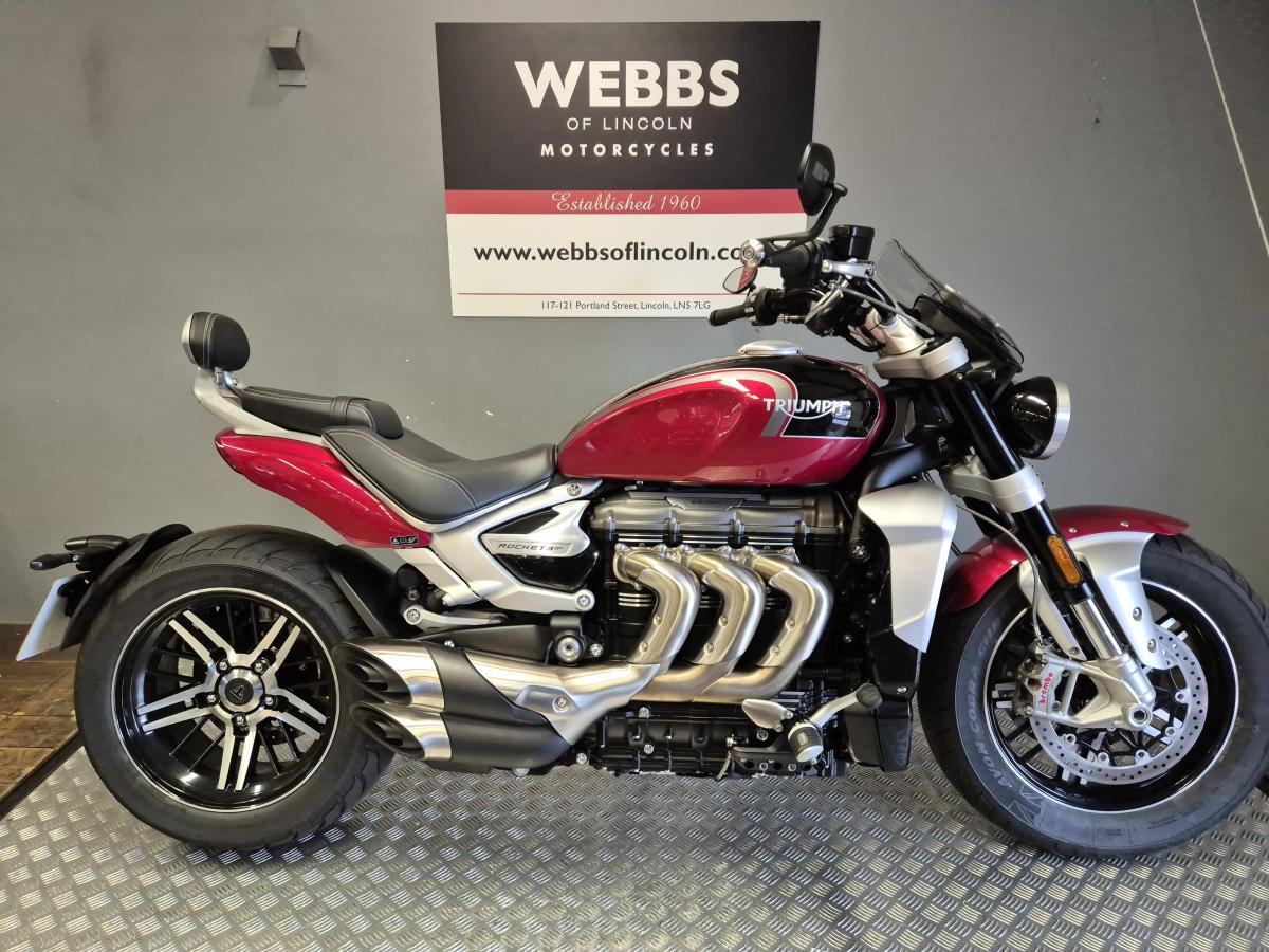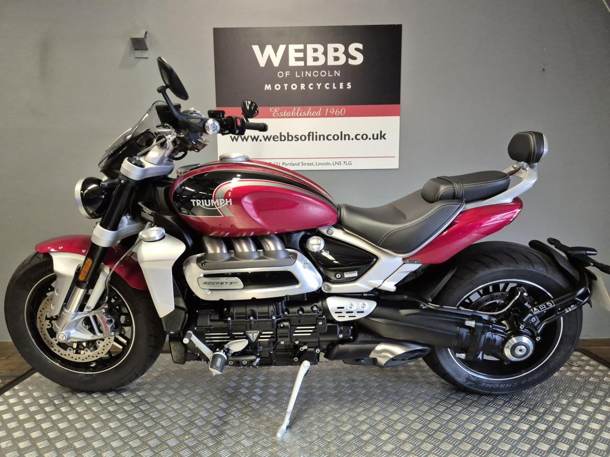 If your on the look out for a very low mileage, almost new Rocket 3 GT finished in the stunning Carnival Red & Sapphire Black paint scheme. L@@K no further! This fine example was first registered in September 2023 on a '23 plate. Having two owners and with ONLY 489 MILES!!! you will benefit from the remainder of Triumph's extended warranty - Thus taking you right up to September 2026 and you won't be needing an MOT until then too! So, if you like a bit of umph this Tri'umph's peak power is 167PS at 6000 rpm (11% up on the previous generation), so the Rocket 3 offers a thrilling ride (with more power from a low 3500 rpm and all the way up to a higher redline of 7000 rpm)