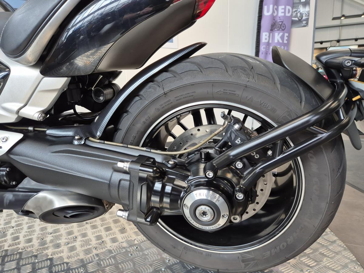 This mighy fine Rocket 3 GT finished in Phantom Black was first registered in August of 2020 and is running on a private plate 'L25 RKT' based on a '2.5Ltr Rocket' (can go back on to its age related plate if desired). With almost 30,000 miles covered, she's backed up with full main dealer service history (The last one by us in June 2024 at exactly 25k miles). Fitted out with some tasty extras comprising of a Carbon Fibre front mudguard and rear hugger, heated grips, rear luggage rack, rubber tank pads, LED fancy indicators, headlight protectors and a set of CNC machined bar end mirrors. A very nice, well cared for Rocket 3! Not to be missed...