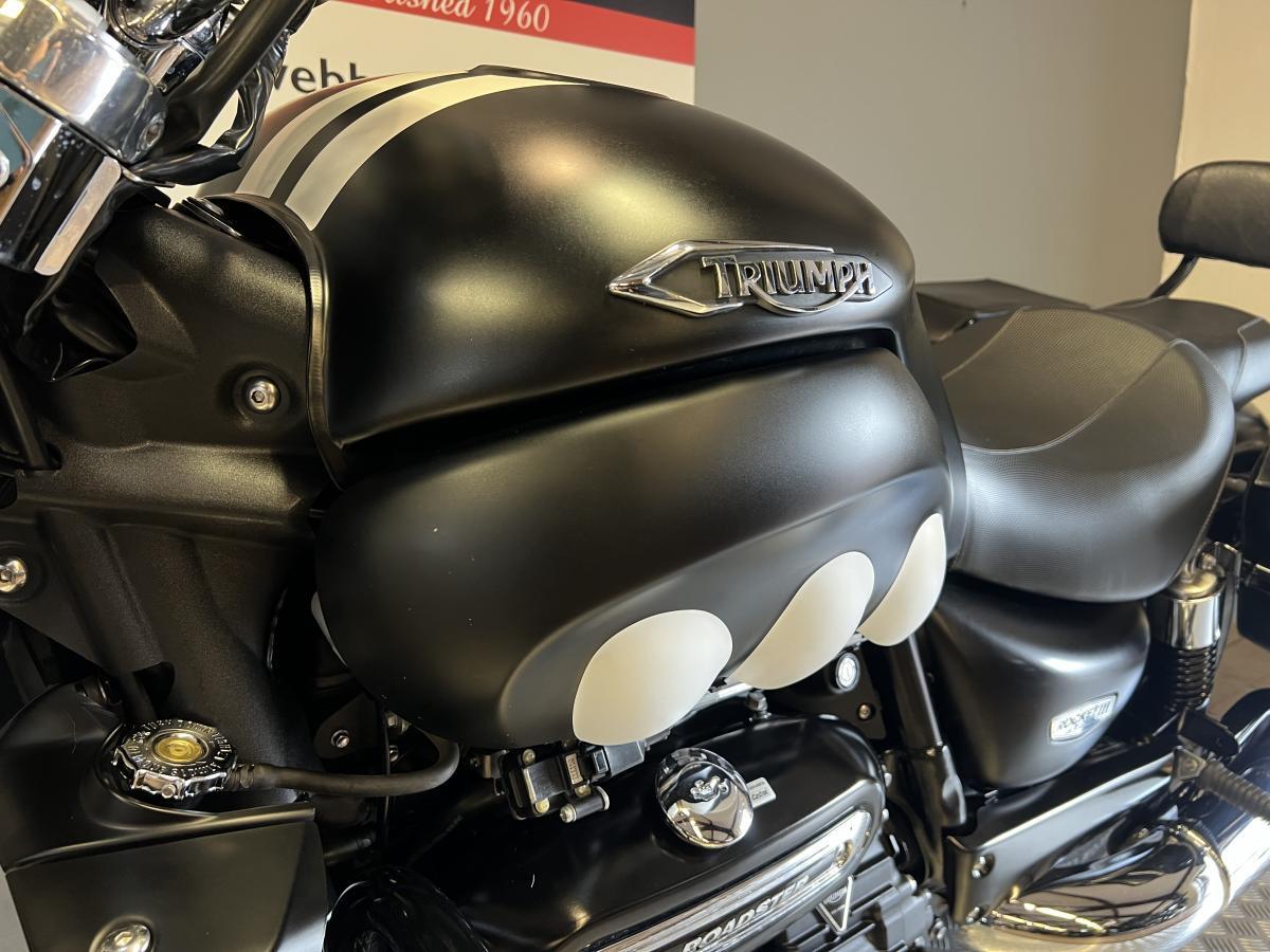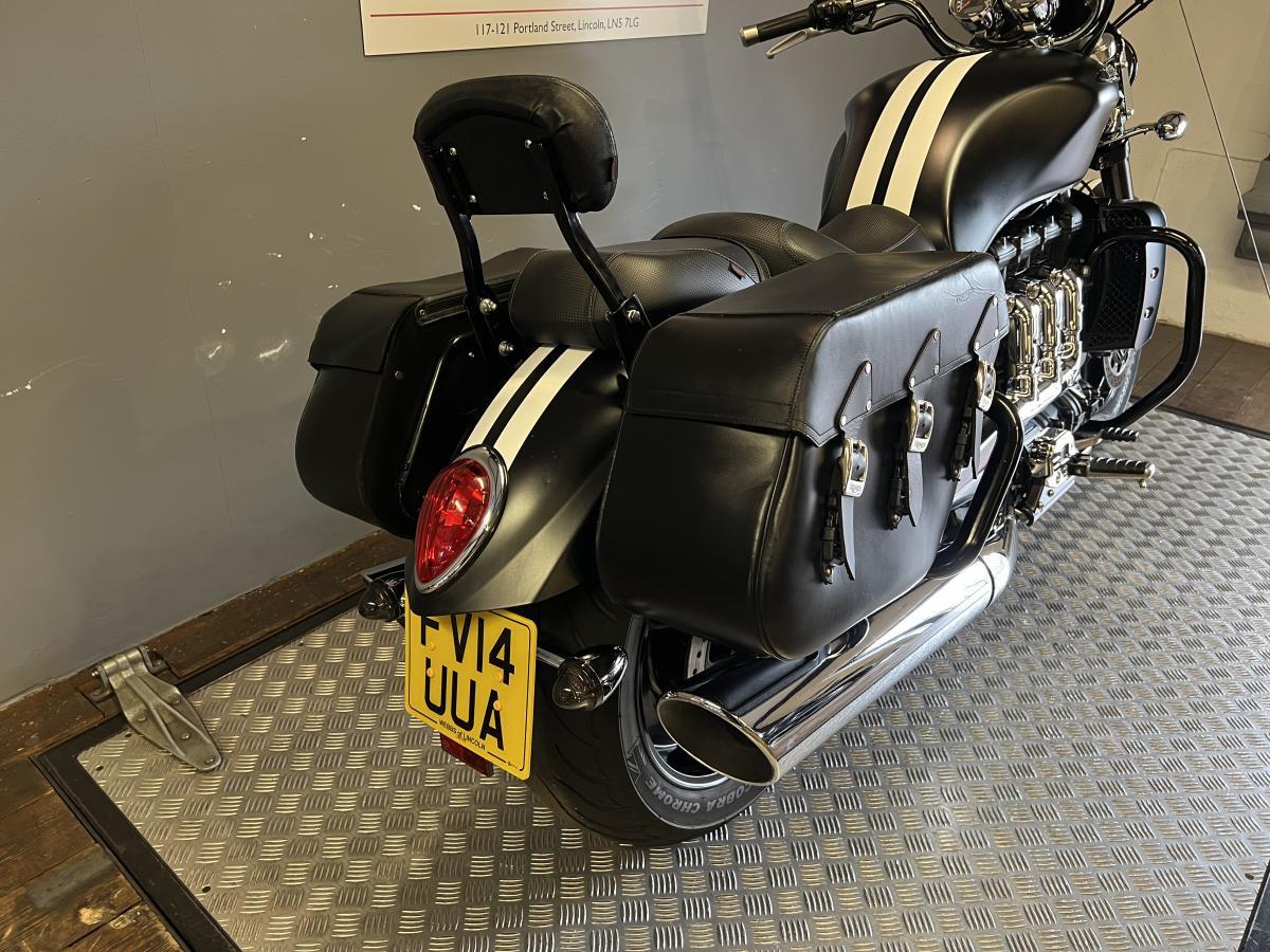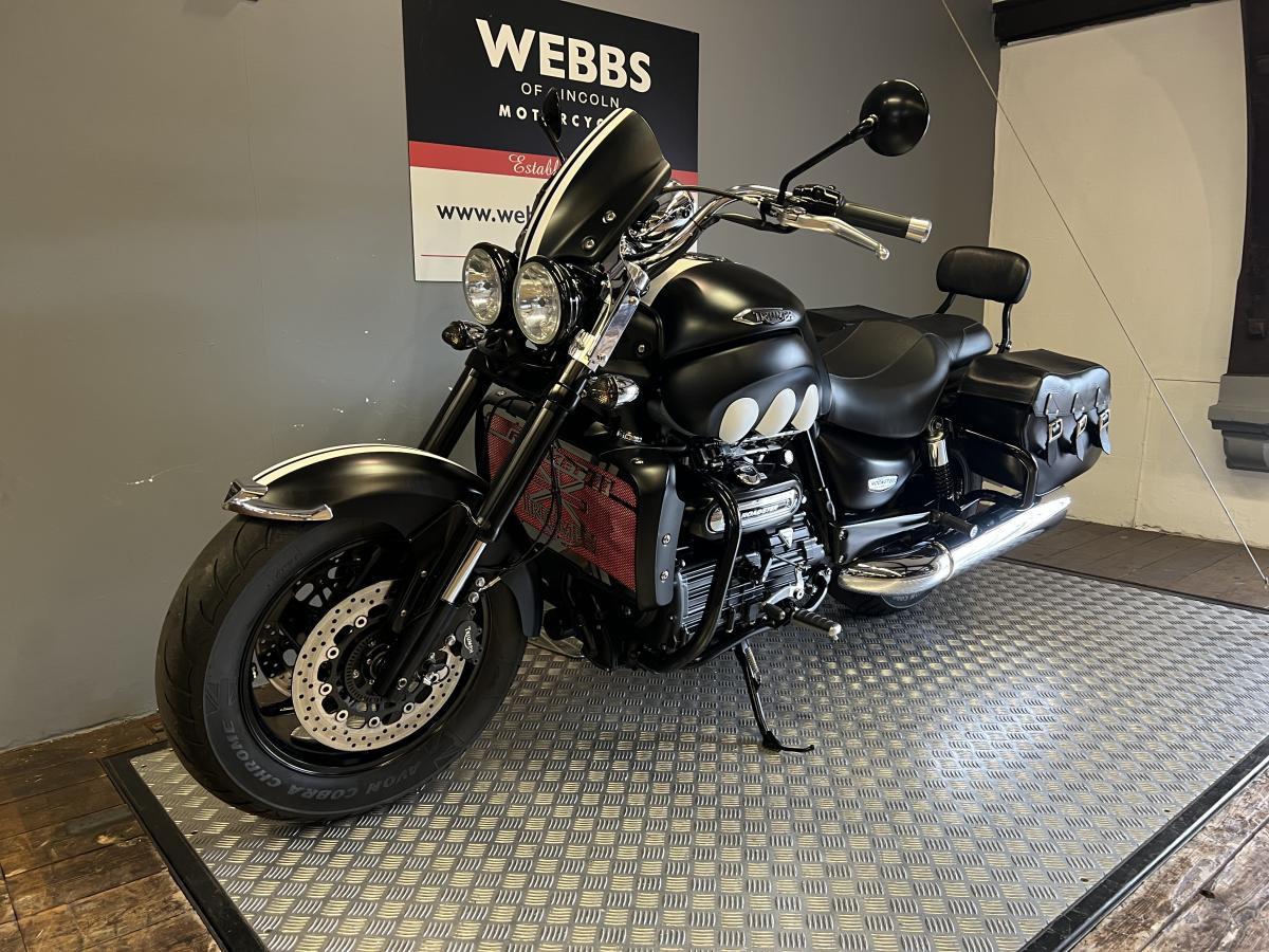 Oh my word...This is a beauty! This Rocket III Roadster ABS is a shaft-drive power cruiser with 2.3Ltrs of pure muscle on tap! Finished in Matt Phantom Black and White viper strips. Supplied and serviced by us here at Webbs of Lincoln Triumph. First registered in late July 2014 on a '14 plate. Having four owners from new with just shy of 13,500 miles covered. Serviced by us in 2014, 2016, 2018, 2020 and 2024 (10k service) plus, recent tyres and a new battery fitted. Also, fitted with a plethora of accessories comprising of; colour coded fly screen in Matt Phantom Black & white strips, heated grips, black engine bars and a set of rear dresser bars too. There is comfort seats and a sissy bar with comfort backrest pad for a pillion and a rear luggage rack in black. Plus, luggage rails and leather panniers, Ignition relocation kit and topped off with a fancy stainless steel radiator guard - with a touch of red for that bit of bling! Not fogetting a RAMAIR Filter kit and a sweet sounding set of TOR exhausts. The Rocket III Roadster is such an iconic bike and quite a rare find in this colour-combo it seems. So, please don't miss this!...