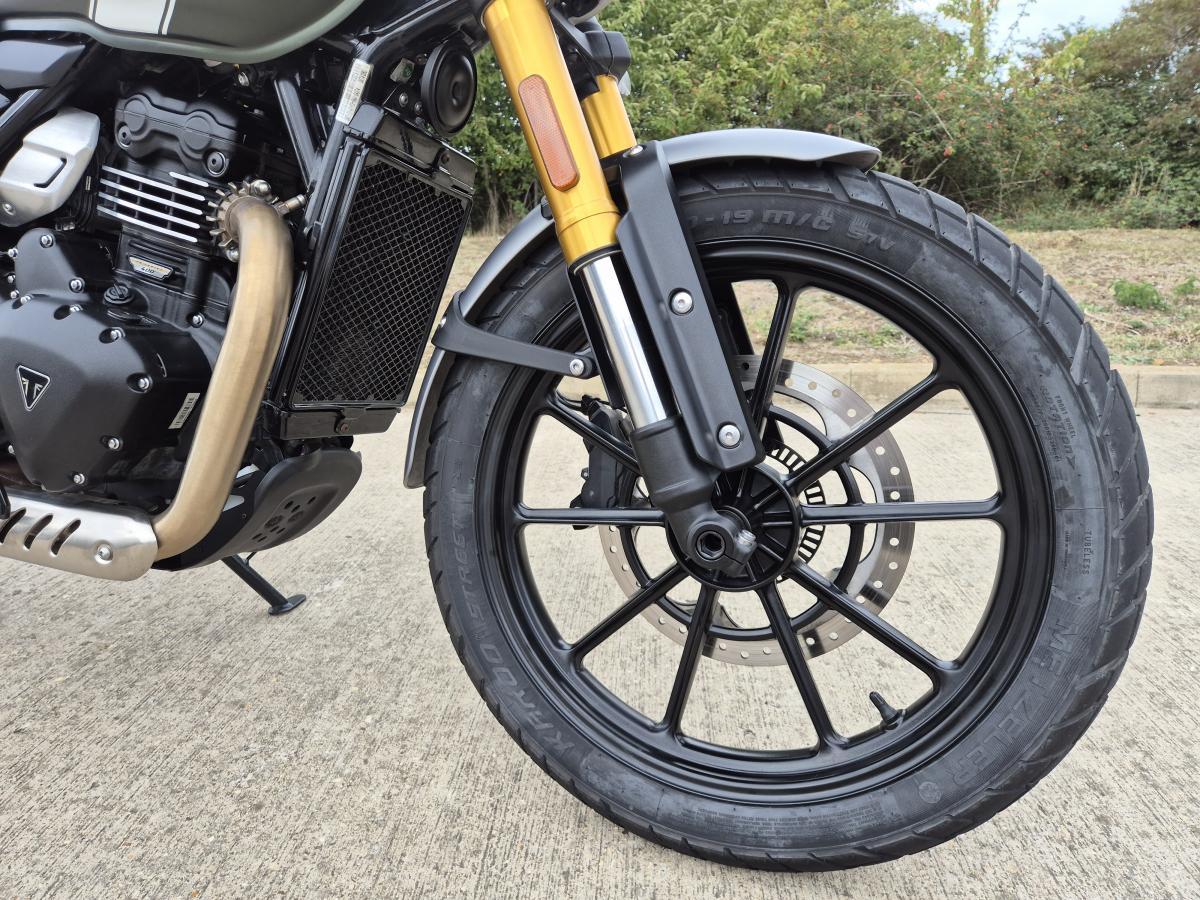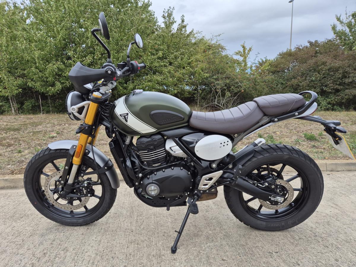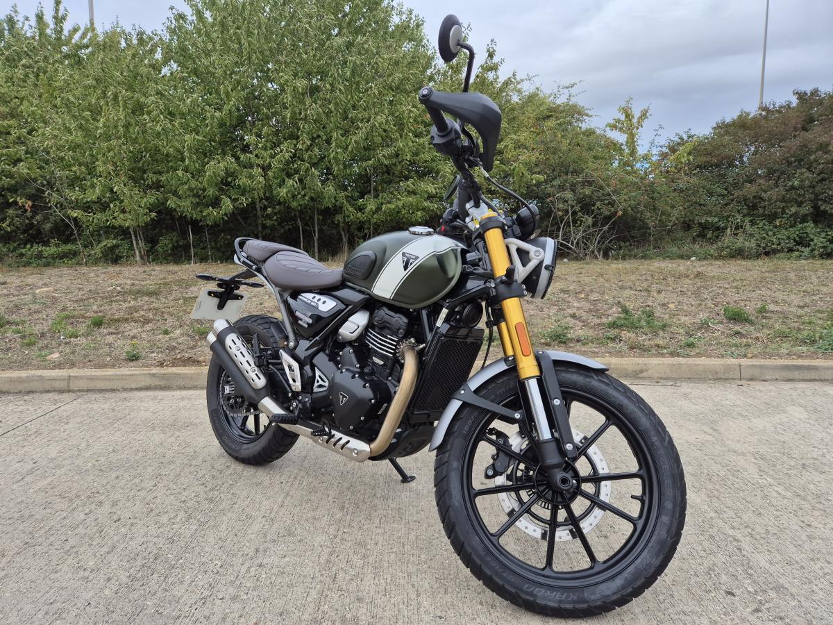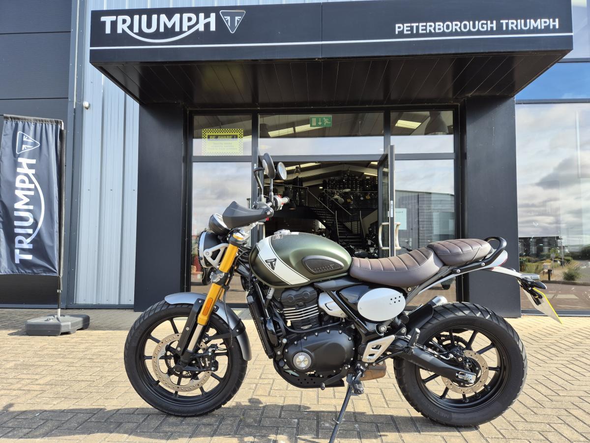 This fantastic Scrambler 400 X. We registered this little beauty to ourselves here at Webbs of Peterborough Triumph in late October 2024 on a '74 plate. Prepared, run-in, safety checked regular, and service in-house being a part of our Spring/Summer Workshop Courtessy fleet. Finished in the much sought-after Matt Khaki Green and White colour combo. Currently, with just shy of 1500 miles covered, this Scrambler 400 X will soon be looking for a new home. Comes to you with loads of warranty and RAC cover remaining. Saving you around £850 over RRP!