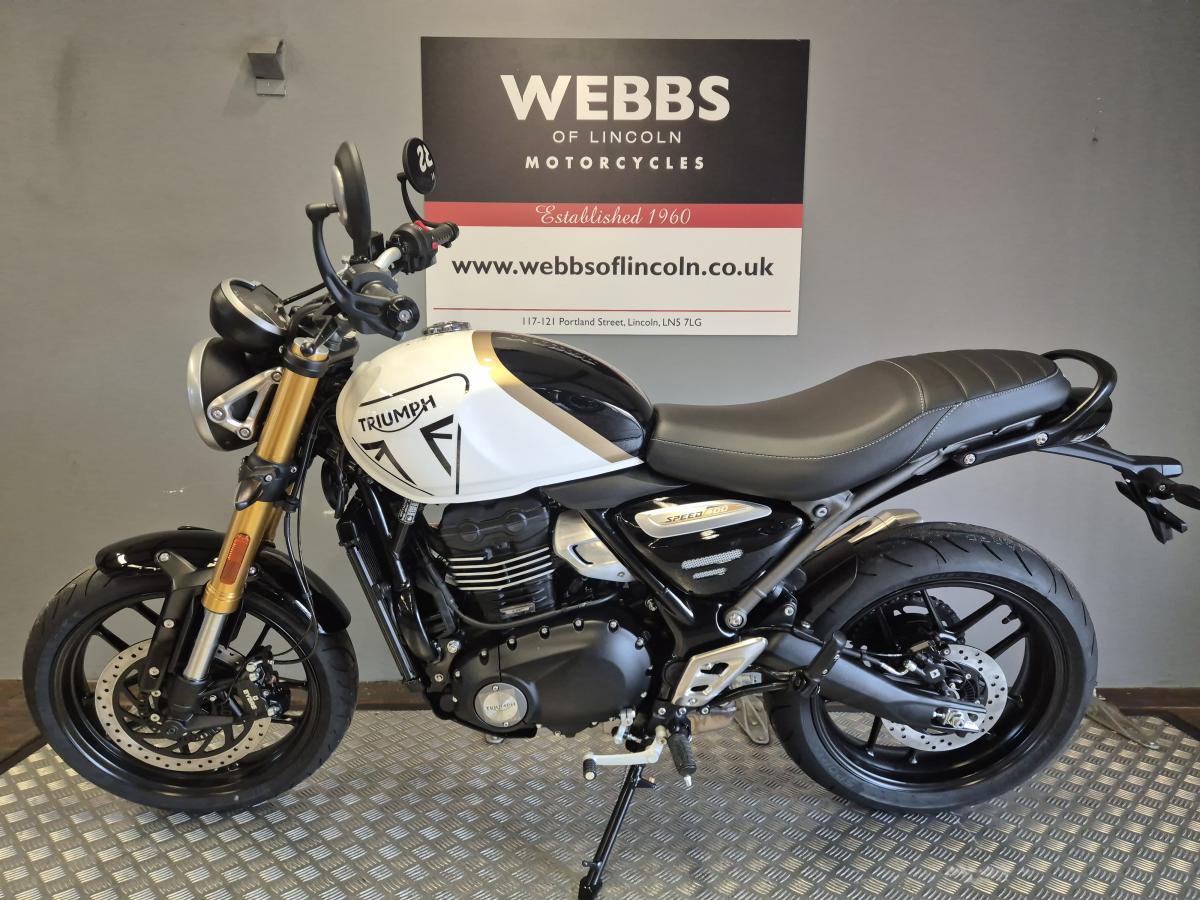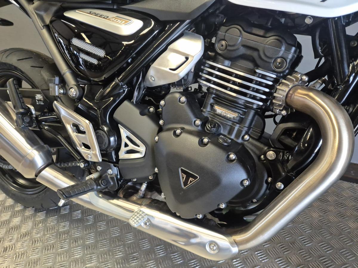 Brand new & unregistered Triumph Speed 400 finished in Pearl Metallic White and Phantom Black.