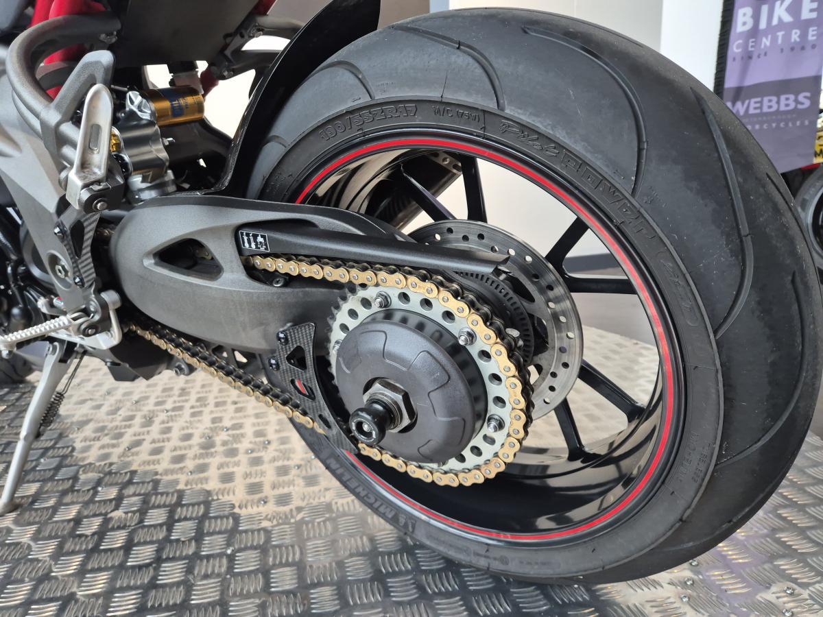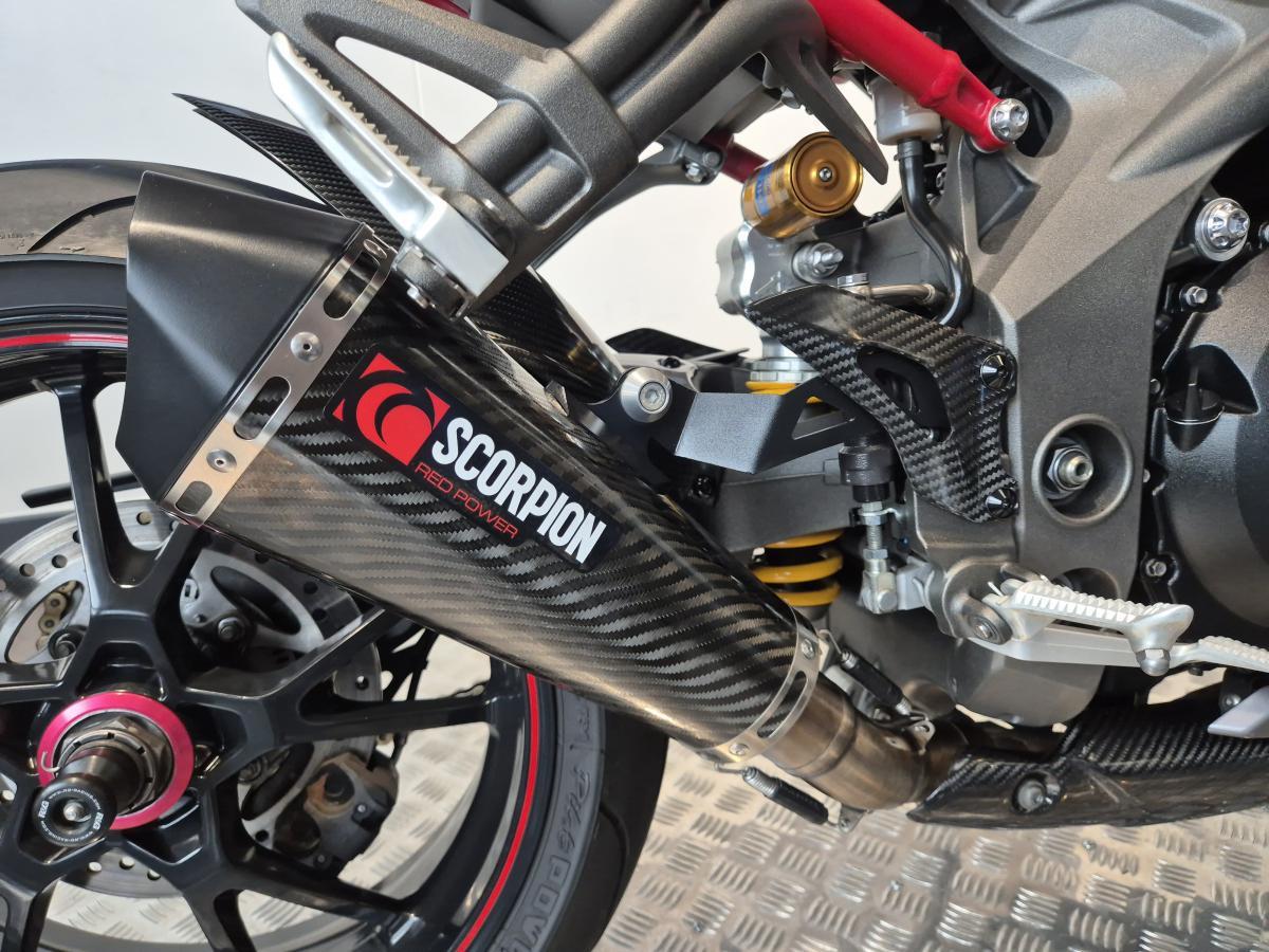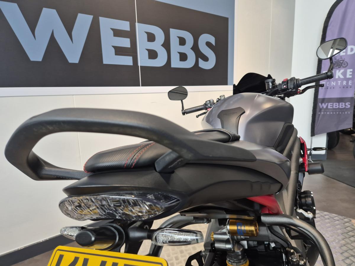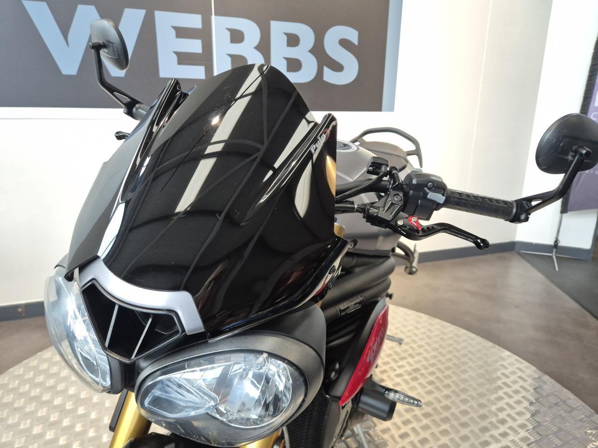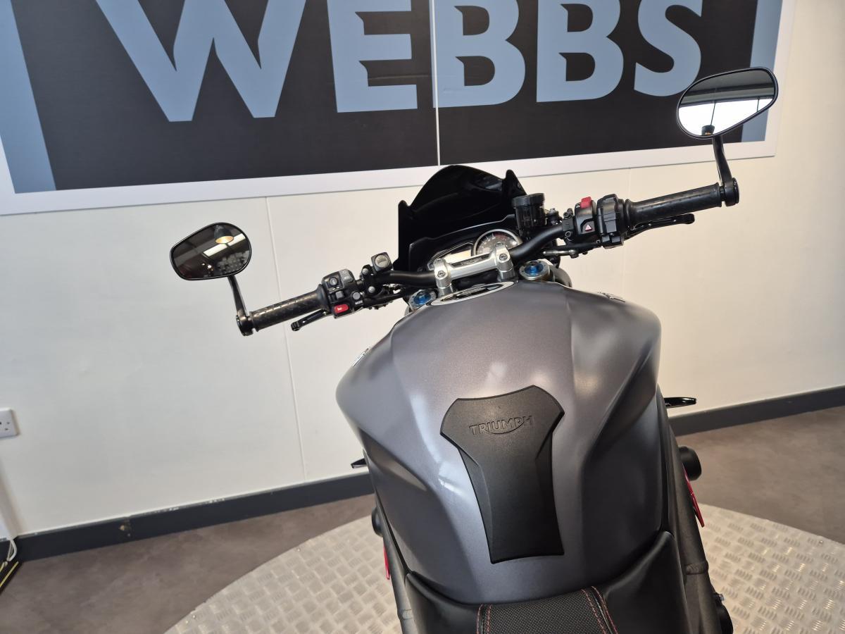 Scorpion 'low' carbon exhaust, Evotech tai tidy/crash protectors/front & rear bobbins, adjustable and radiator guard. Triumph pillion grab rail, LED indicators, heated grips, colour coded seat cowl and tank pad. Bar end mirrors, carbon fibre rear mudguard, heel guards and a Datatool S4 alarm. There is also paperwork included for a re-map from BSD (See image attatched).