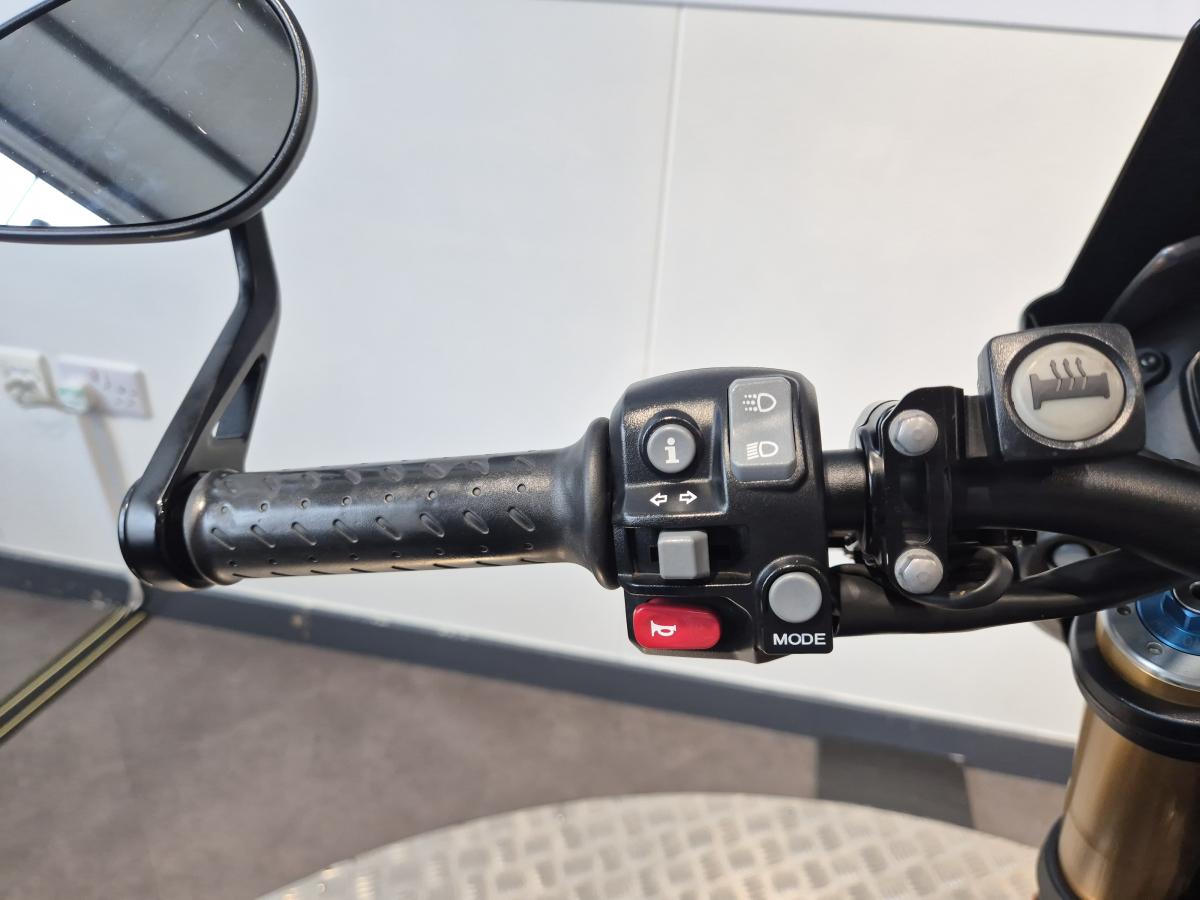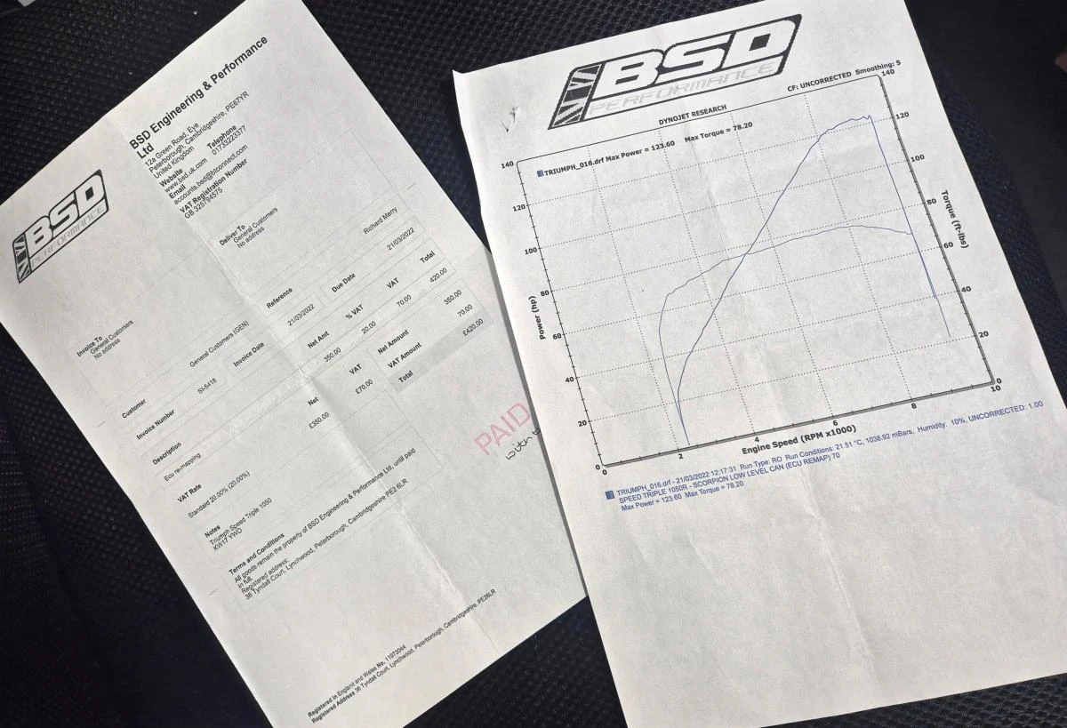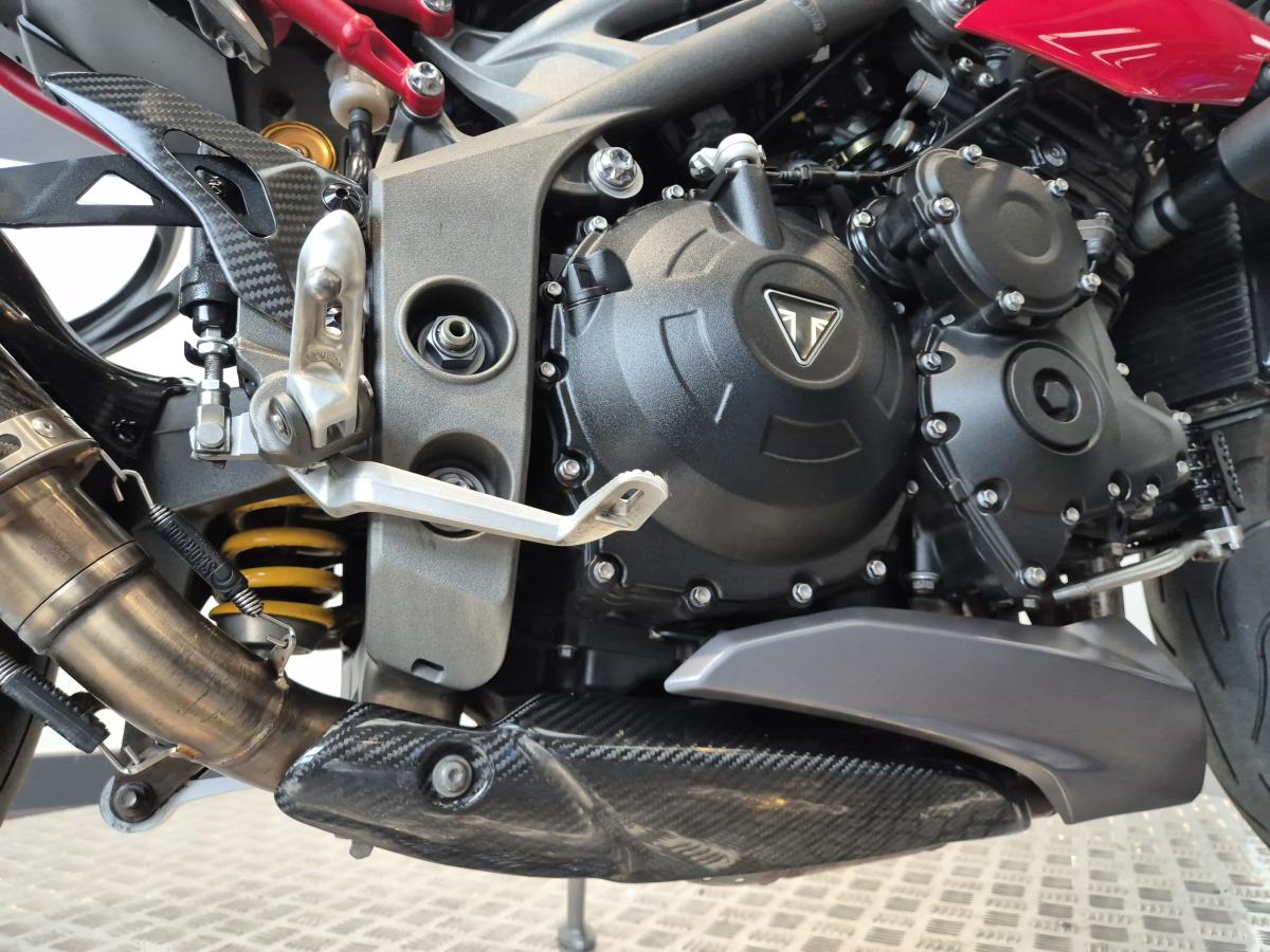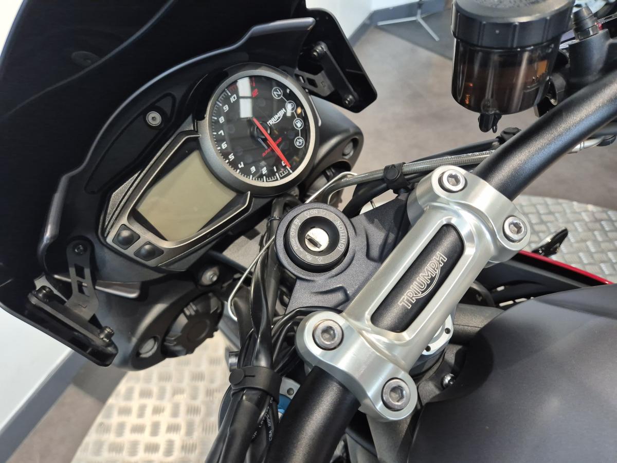 Scorpion 'low' carbon exhaust, Evotech tail tidy/crash protectors/front & rear bobbins, adjustable levers and radiator guard. Triumph pillion grab rail, LED indicators, heated grips, colour coded seat cowl and tank pad. Bar end mirrors, carbon fibre rear mudguard, heel guards and a Datatool S4 alarm. There is also paperwork included for a re-map from BSD (See image attatched).