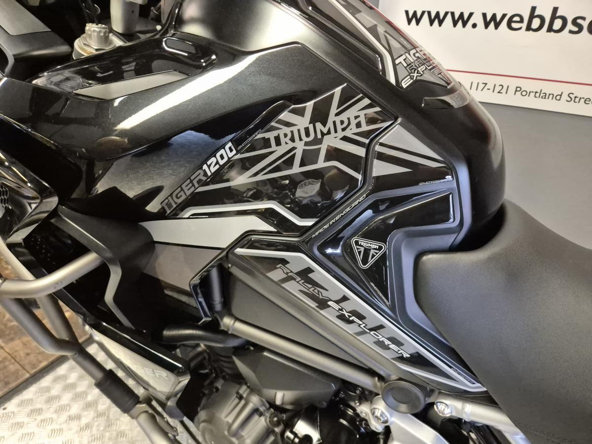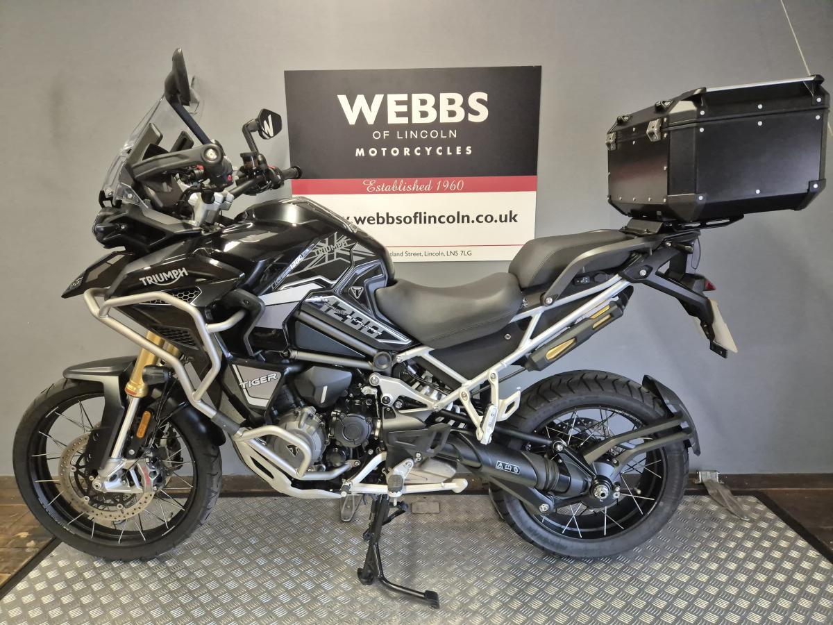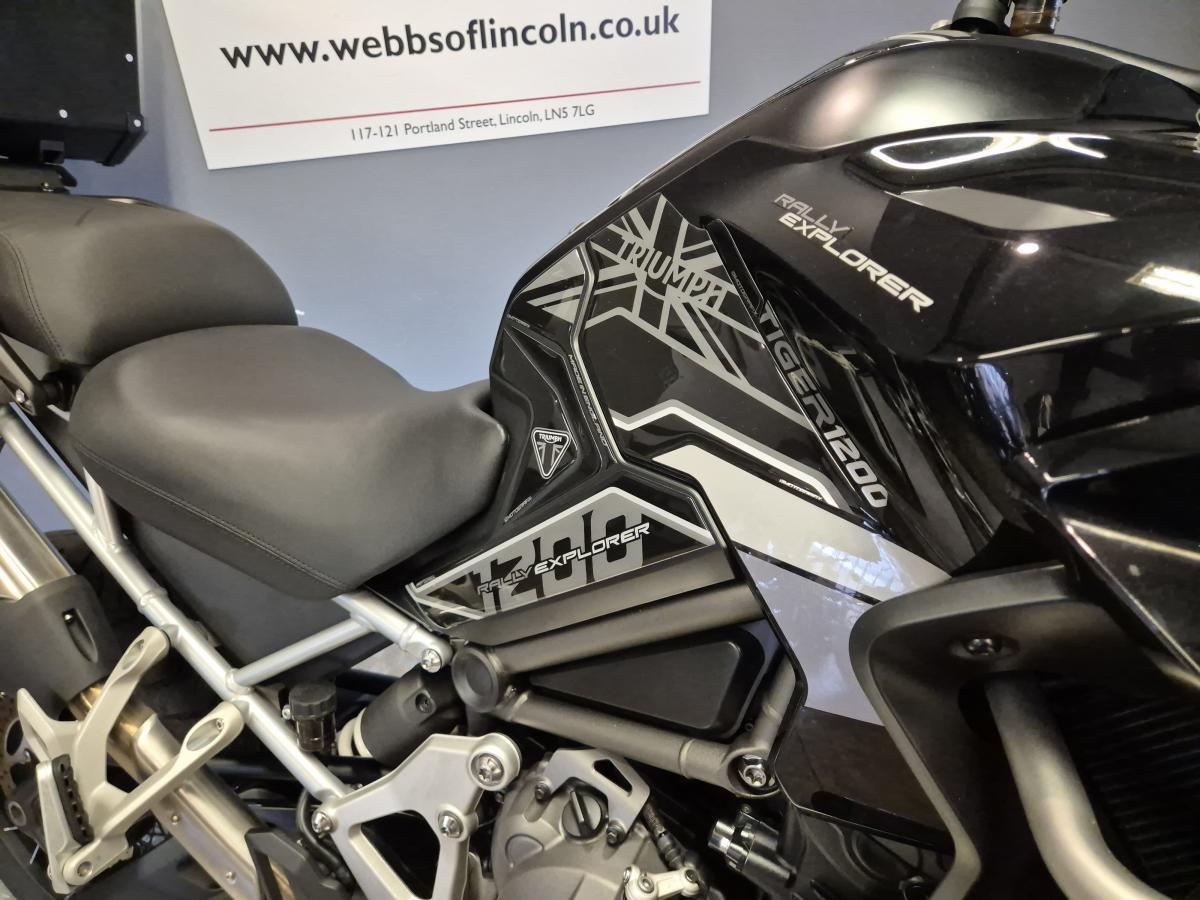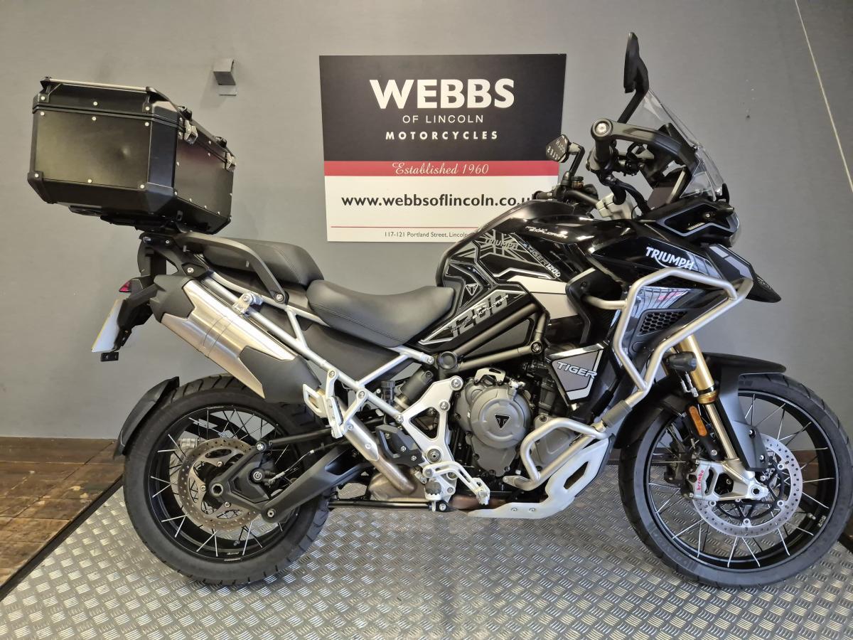 Triumph's big 30L tank adventure bike! Finished in Sapphire Black this Tiger 1200 Rally Explorer was first pre-registered by us here at Webbs in March 2024 on a 24 plate before being sold to the previous owner in April 2024. Now with 12,160 miles on the clock this Tiger is fitted with a large 58L black Givi top box and a 'Tiger' decal kit on top of the high level of specification featured as standard including electronic suspension, heated seats and grips, cruise control, keyless ignition, blind spot radar and much more! Full Webbs service history (2 stamps in the book) and comes with Datatag ID security.
