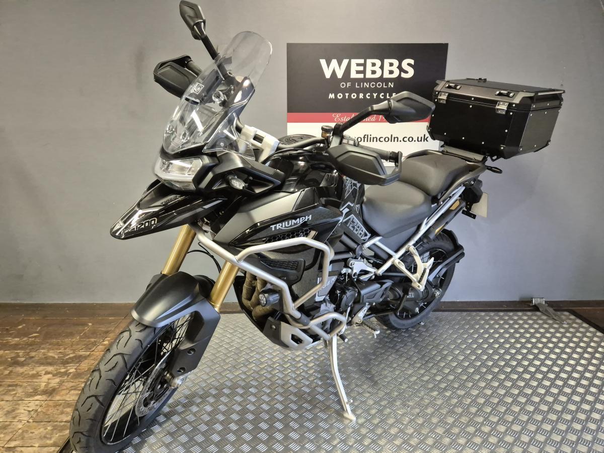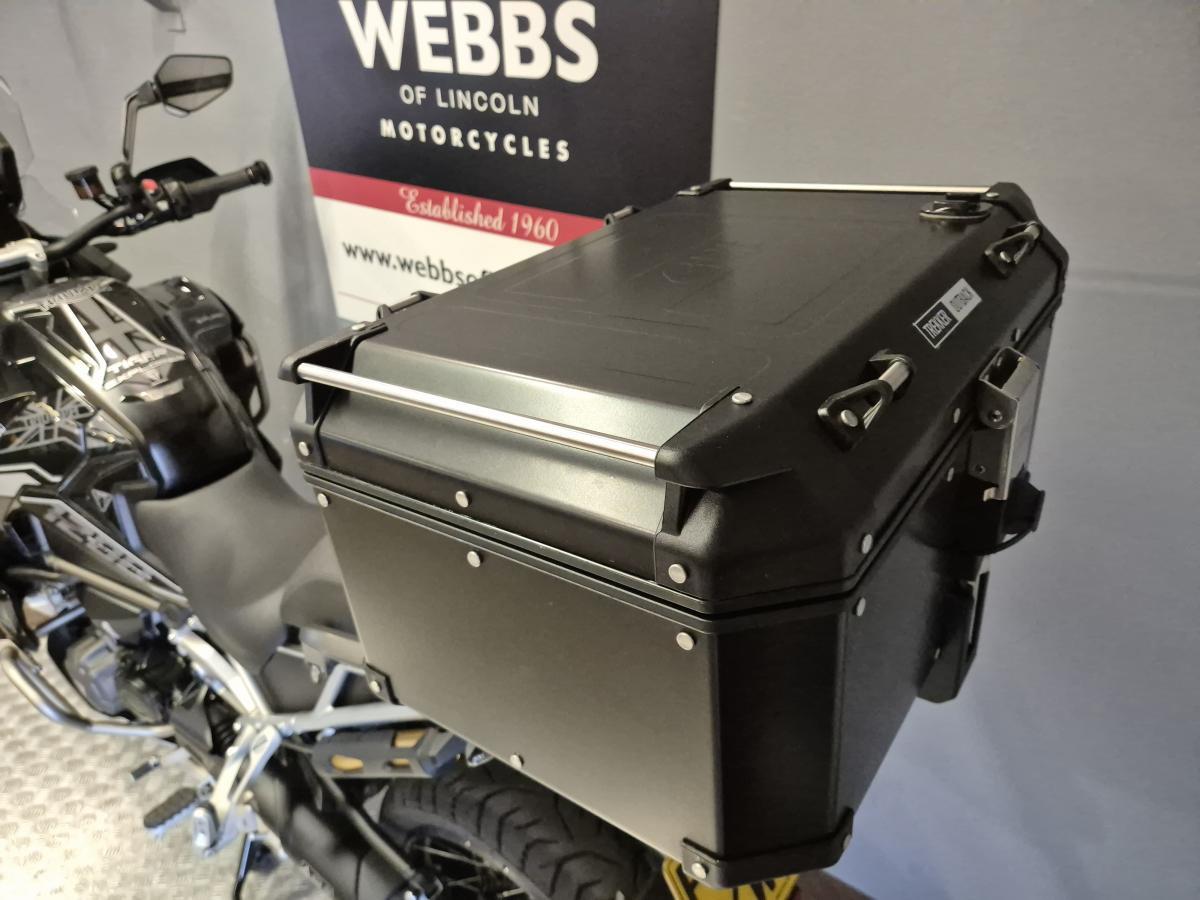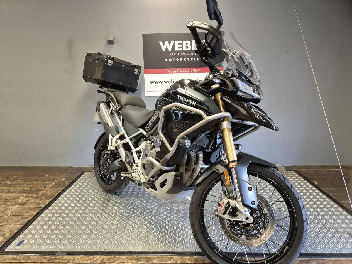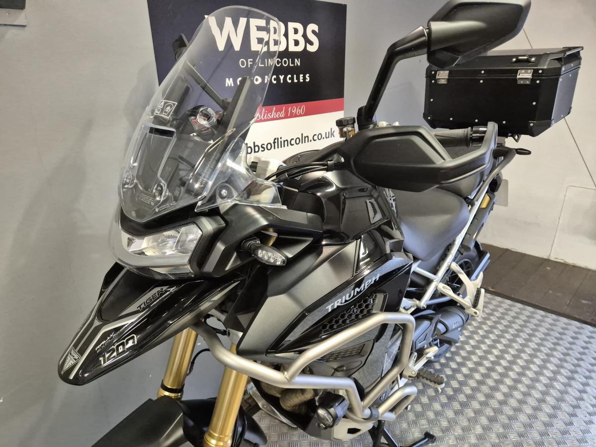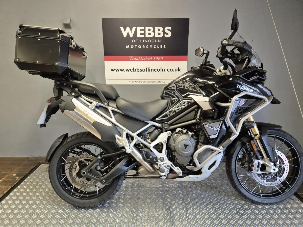 Triumph's big 30L tank adventure bike! Finished in Sapphire Black this Tiger 1200 Rally Explorer was first pre-registered by us here at Webbs in March 2024 on a 24 plate before being sold to the previous owner in April 2024. Now with 12,160 miles on the clock this Tiger is fitted with a large 58L black Givi top box and a 'Tiger' decal kit on top of the high level of specification featured as standard including electronic suspension, heated seats and grips, cruise control, keyless ignition, blind spot radar and much more! Full Webbs service history (2 stamps in the book) and comes with Datatag ID security.